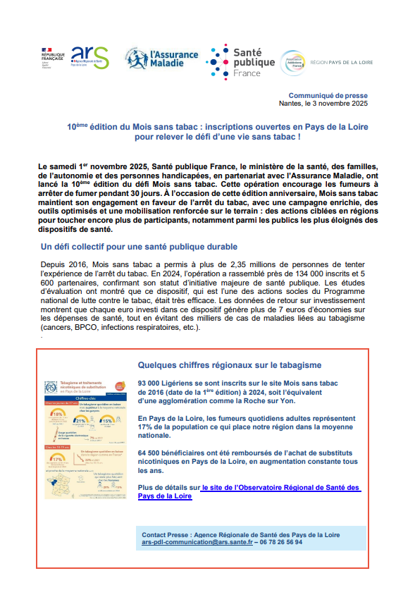 Communiqué de presse Pays de la Loire Mois sans tabac 2025